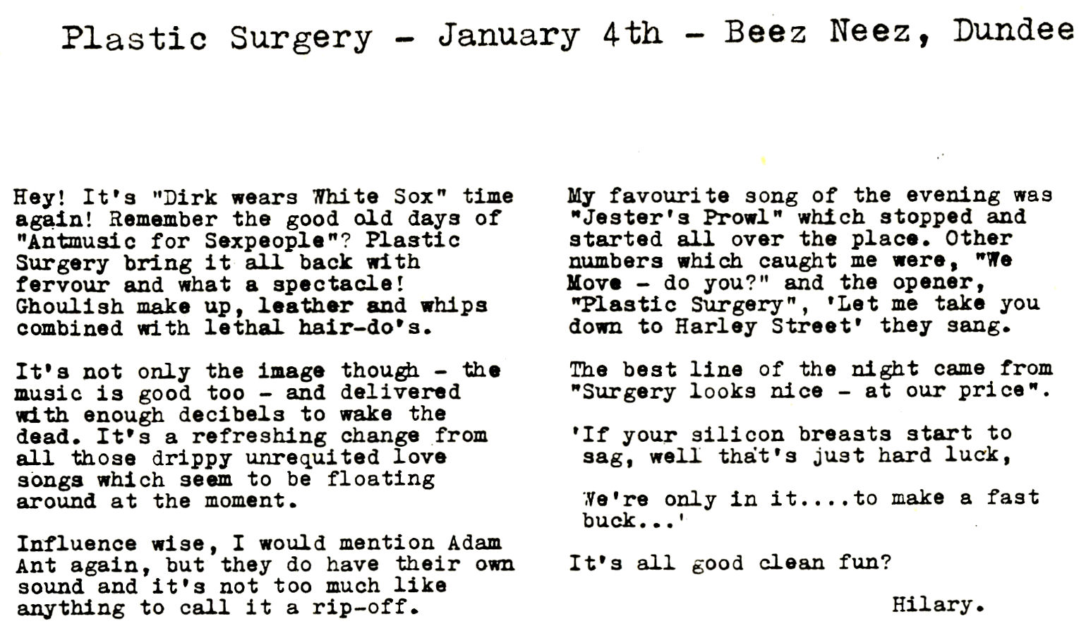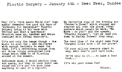 Rounding things off with Plastic Surgery who were doing the biz at Beez Neez in January '85. This time Hilary is well pleased with what she saw!