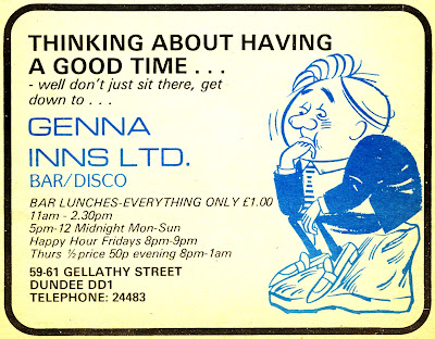 Can't say I was a regular at Gennas in Gellatly Street, but I do remember popping along there from time to time on Thursday's, and reading again this 1984 advert above, now I realise why - it was half price night!