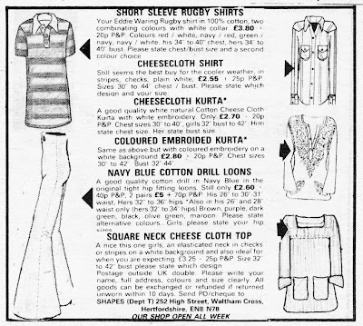 The top ad is dated 1978 and features gear with a distinctly early 70's look - rugby shirt, cheesecloth shirt, embroidered kurta, loons and smock top.